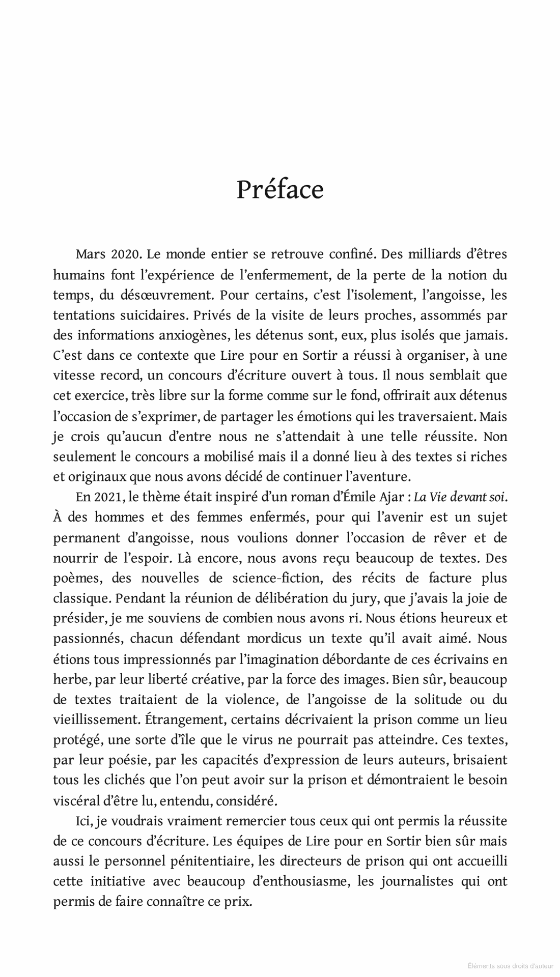 À partir de ces mots : " la vie devant nous ", des personnes détenues et des membres du personnel de 35 établissements pénitentiaires se sont livrés à une expression libre, introspective, imaginative, dans le cadre d'un concours d'écriture organisé par l'association Lire pour en Sortir dont la marraine est l'auteure Leïla Slimani.