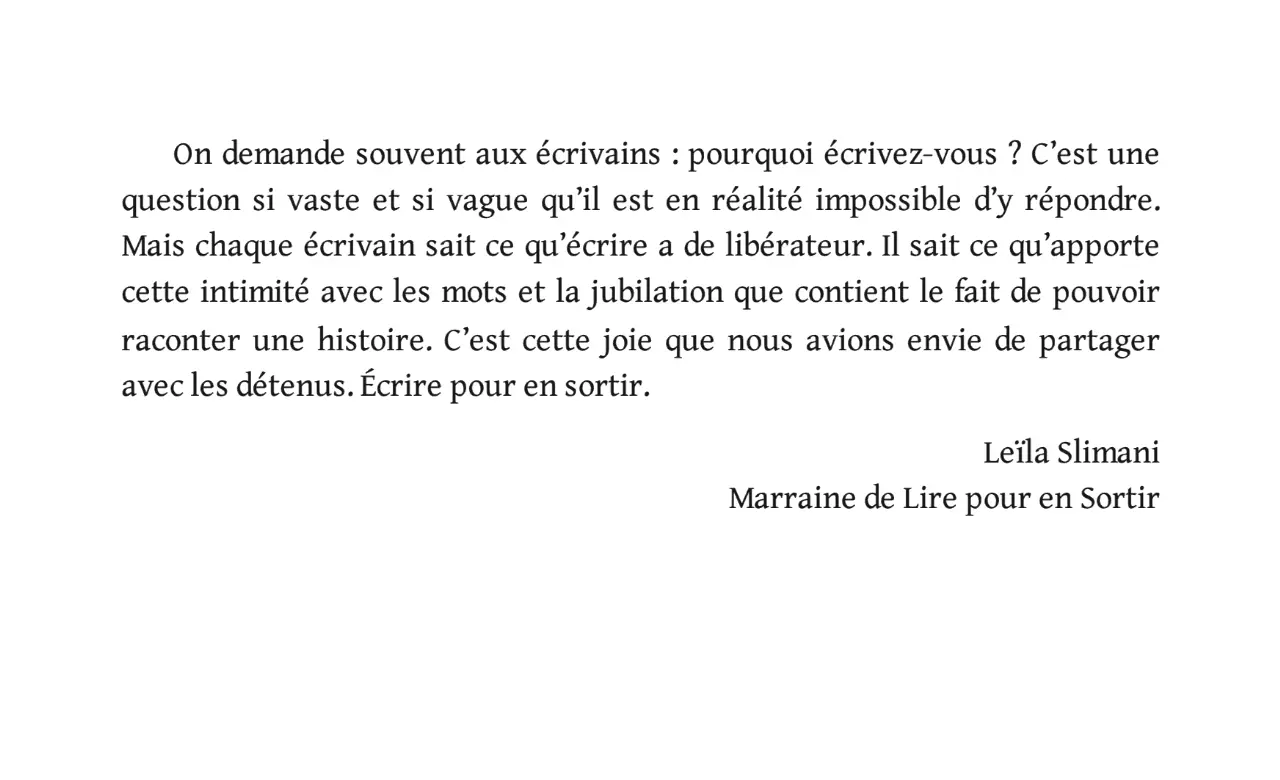 " Chaque écrivain sait ce qu'écrire a de libérateur. Il sait ce qu'apporte cette intimité avec les mots et la jubilation que contient le fait de pouvoir raconter une histoire. C'est cette joie que nous avions envie de partager avec les détenus. Écrire pour en sortir. "
